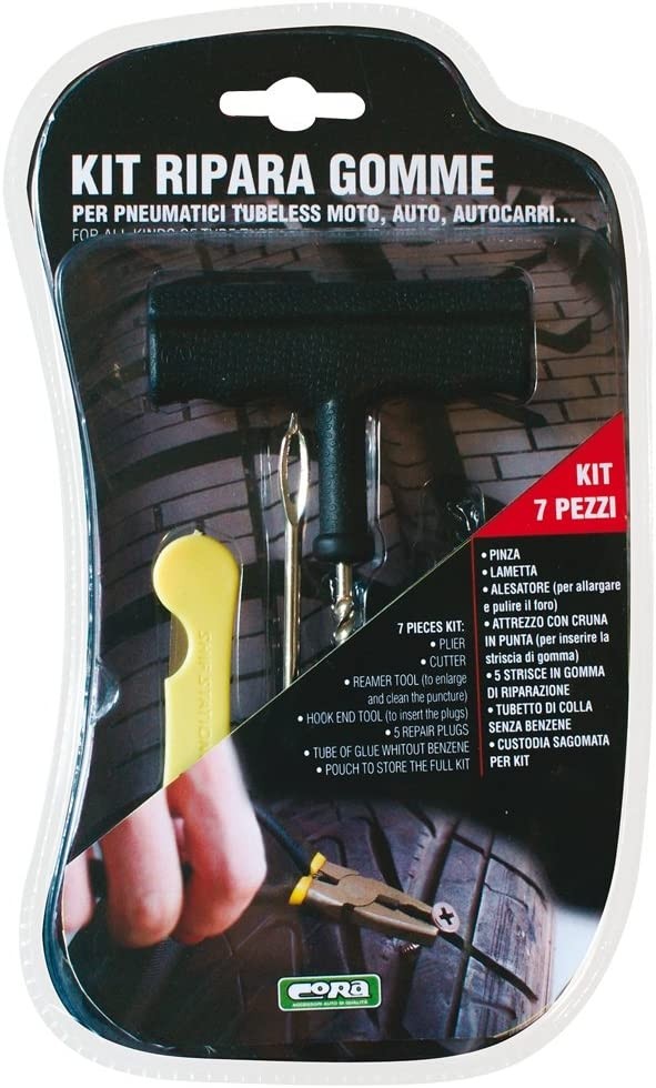 KIT RIPARA GOMME PNEUMATICI TUBELESS CORA 120812 Kit completo per riparare le forature su pneumatici tubeless di auto, moto e autocarri in modo efficace e duraturo. Minimo ingombro grazie alla pratica custodia salvaspazio. Pratico, efficace e sicuro. Contenuto del kit 7 pezzi: pinza, cutter, alesatore per allargare e pulire il foro, punteruolo con cruna in punta per inserire la striscia di gomma, 5 strisce in gomma di riparazione, tubetto di colla senza benzene, custodia sagomata per kit. Kit completo per riparare le forature su pneumatici tubeless di auto, moto e autocarri. Pratico, efficace e sicuro. Minimo ingombro grazie alla pratica custodia salvaspazio. Per supporto all'acquisto contattare il servizio clienti. Info e Preventivi: infoshop@marinazauto.it - Whatsapp: (+39) 331 1804865