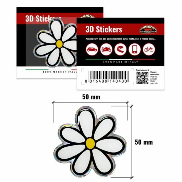 ADESIVO 3D STICKER MARGHERITA QUATTROERRE 14040. Soggetti autoadesivi trattati con resina trasparente a rilievo. Adesività garantita, ottima resistenza nel tempo. Dettagli precisi e colori brillanti. Grazie ai filtri UV Protective non ingialliscono. Dimensioni: 50 x 50 mm.