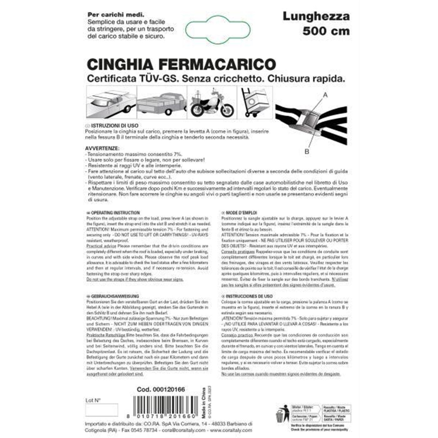 CINGHIA FERMABAGAGLI 500 CM IN NYLON CON FIBBIA METALLICA CORA 120166 Cinghia fermabagagli in nylon con fibbia metallica. Consigliata per il fissaggio di carichi medi (turismo ecc.). Lunghezza: 5 mt. Certificata TUV-GS. Cinghia fermabagagli in nylon con fibbia metallica Consigliata per il fissaggio di carichi medi Lunghezza: 5 mt Certificata TUV-G