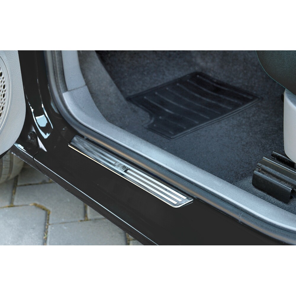 Profili battitacco in acciaio inox - PB-4 - 330x32 mm. PILOT 02044. Con zigrinatura. Si applicano tramite adesivo speciale senza praticare alcun foro. Universali per tutte le vetture con profilo battitacco portiera uguale o maggiore di 32 mm