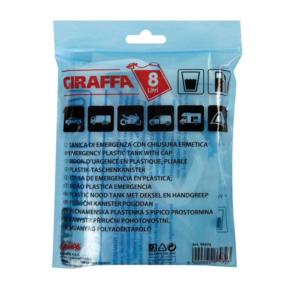 Giraffa, tanica di emergenza - 8 L. TANICA DI EMERGENZA DA 8 LT LAMPA 66972. Sempre pronta all’uso. Occupa pochissimo spazio, facile e pratica da usare. Riutilizzabile più volte. Con Rapid-Clip autobloccante per una chiusura ermetica.