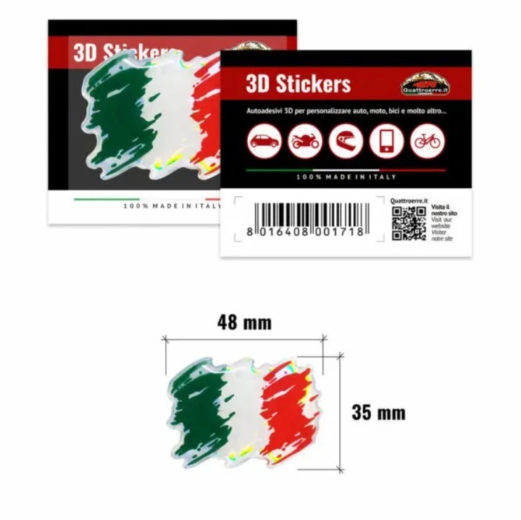 ADESIVO 3D STICKER ITALIA SAGOMATA QUATTROERRE 171. Soggetti autoadesivi trattati con resina trasparente a rilievo. Adesività garantita, ottima resistenza nel tempo. Dettagli precisi e colori brillanti. Grazie ai filtri UV Protective non ingialliscono. Dimensioni: 48 x 35 mm.