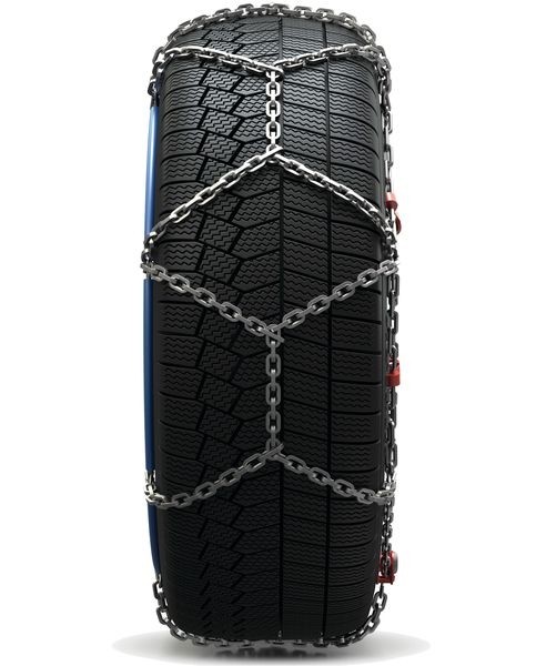 Serie catene neve da 16 mm di ingombro interno. Sistema di tensionamento manuale: uno stop per montare la catena e uno per tensionarla. Ganci di rinvio con spondina per evitare che la catena si impigli.