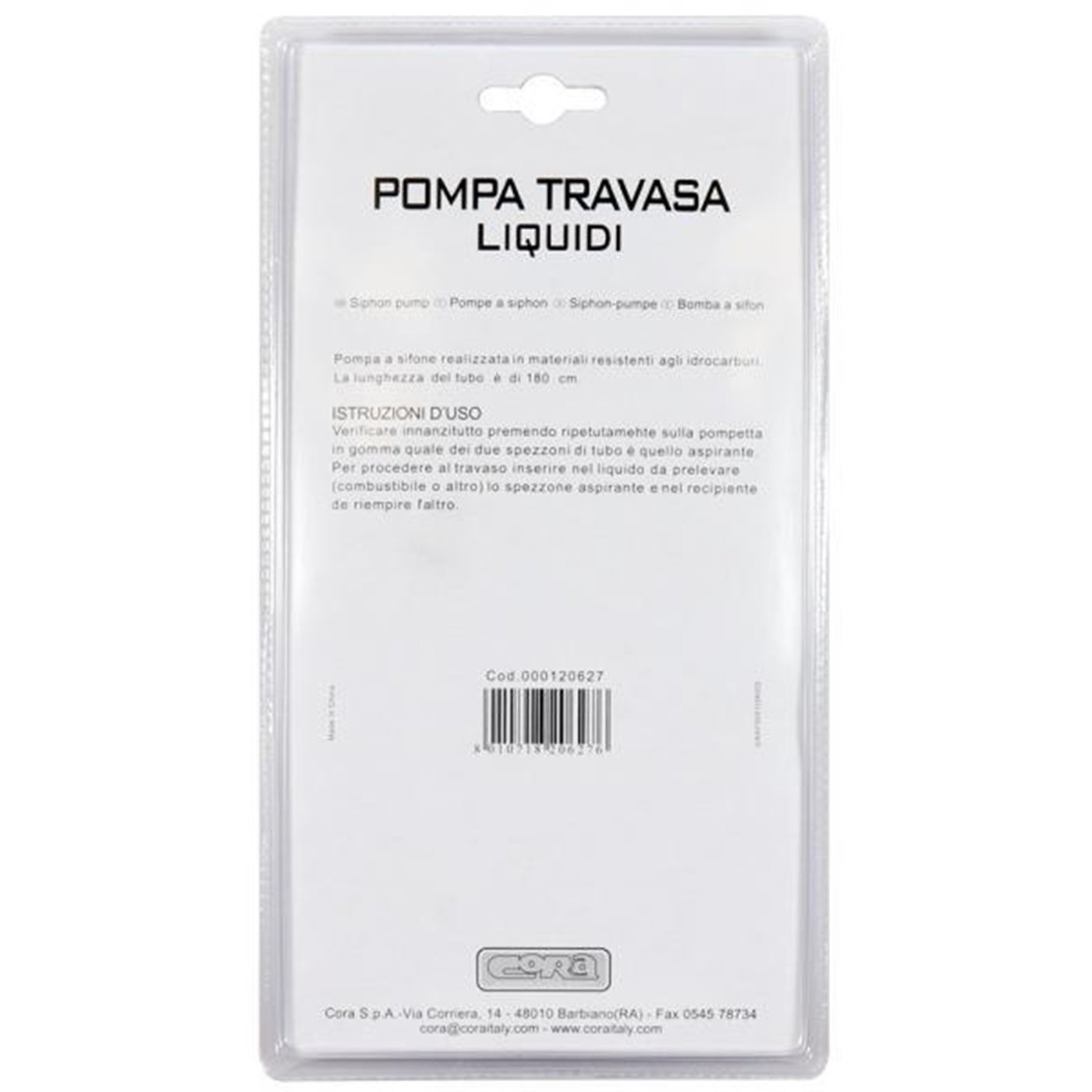 POMPA A SIFONE TRAVASA LIQUIDI PROFESSIONALE CORA 120627 Pompa a sifone professionale realizzata con materiali resistenti agli idrocarburi. Lunghezza tubo 180 cm. Pompa a sifone professionale Realizzata con materiali resistenti agli idrocarburi Lunghezza tubo 180 cm