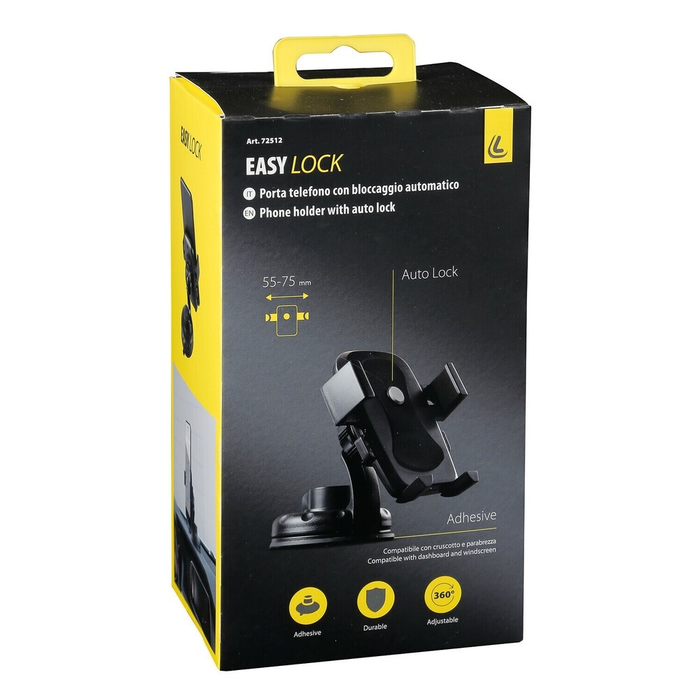PORTA TELEFONO CELLULARE CON BLOCCAGGIO AUTOMATICO EASY LOCK - LAMPA 72512 Bloccaggio del telefono in automatico quando lo si posiziona sul porta telefono. Montaggio facile e veloce. Snodo regolabile a proprio piacimento. Ventosa con base adesiva per una presa ancora più sicura su parabrezza e cruscotto. La base adesiva può essere lavata con acqua. Non macchia e non lascia residui. Per telefoni max 75 mm. Per supporto all'acquisto contattare il servizio clienti. Info e Preventivi: infoshop@marinazauto.it - Whatsapp: (+39) 331 1804865
