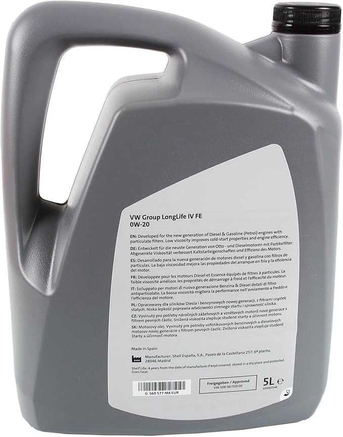 OLIO 0W-20 MOTORE 5L LONGLIFE 4 VISCOSITA' SAE 0W20 VOLKSWAGEN GROUP. GS60577M2EUR OLIO MOTORE 1L Longlife IV Longlife 4 Viscosità SAE 0W20 Standard 50800 50900 Oil. Ultima generazione di olio motore. LongLife IV FE Volkswagen Group Original Oil ha una viscosità di 0W-20 e viene utilizzato per fornire nuovi motori speciali. Il nuovo olio LongLife è stato sviluppato per i motori che prescrivono lo standard VW 508.00/509.00. Gli aggregati di nuova concezione raggiungono valori di consumo ed efficienza migliori con l'uso dell'olio per il risparmio di carburante e allo stesso tempo prestazioni migliorate. Con il nuovo olio motore LongLife IV FE sono possibili intervalli di cambio olio fino a 30.000 km o due anni. Grazie alla viscosità ridotta, LongLife IV garantisce una lubrificazione più rapida del motore e dei componenti collegati. Un marcatore chimico viene aggiunto all'olio e lo fa diventare verde. Quindi è facile da distinguere dagli altri oli motore e non può essere confuso. La specifica LongLife IV FE VW 508.00/509.00 non è retro-compatibile. Pertanto, l'olio può essere utilizzato solo negli aggregati rilasciati. L'uso in veicoli senza omologazione può causare danni significativi all'unità. Olio motore originale Volkswagen Longlife IV FE (SAE 0W20). Volkswagen Olio norma: 508 00/509 00. Capacità: 5 litri. Volkswagen Numero di parte: GS60577M4EUR. Progettato per l'ultima generazione di motori a benzina e diesel con filtro antiparticolato | Viscosità ridotta migliorate le proprietà di avviamento a freddo e l'efficienza del motore.
