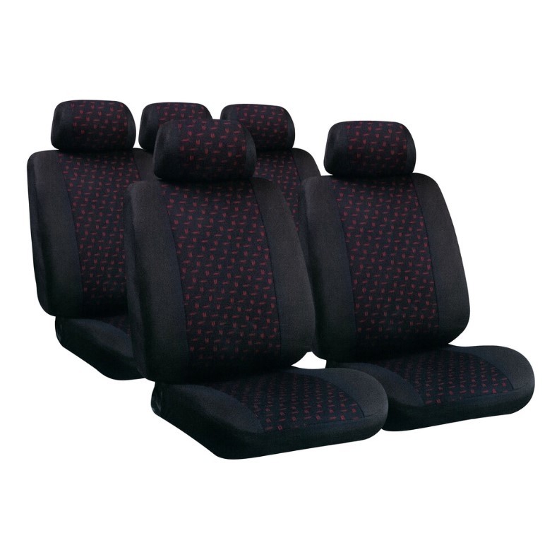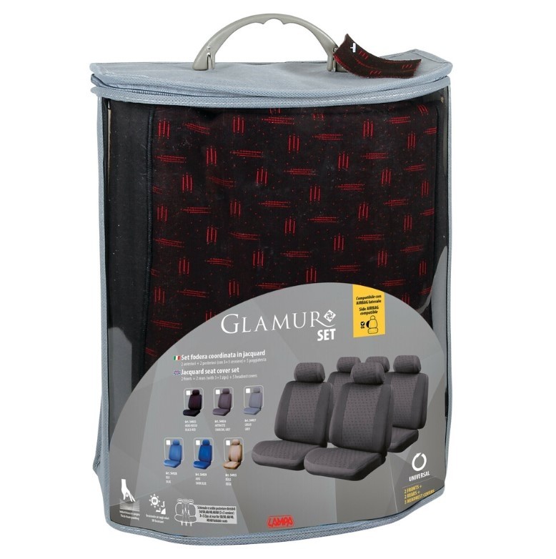 COPRISEDILI ANTERIORI E POSTERIORI COORDINATE IN JACQUARD NERO LAMPA 54925. Set fodere coordinate in jacquard - NERO. Anteriori, 2 posteriori (con 3+3 cerniere), 5 copripoggiatesta. Tessuto in poliestere e imbottiture in spugna. CARATTERISTICHE: Universali per la maggior parte dei sedili standard; Compatibili con sedili forniti di airbag laterali; Colori resistenti alla luce; Imbottitura morbida; Copri poggiatesta inclusi; Schienale e sedile posteriore divisibili 50/50, 60/40, 40/60 (3+3 cerniere). Parte centrale removibile per una maggiore adattabilità ai sedili stretti.