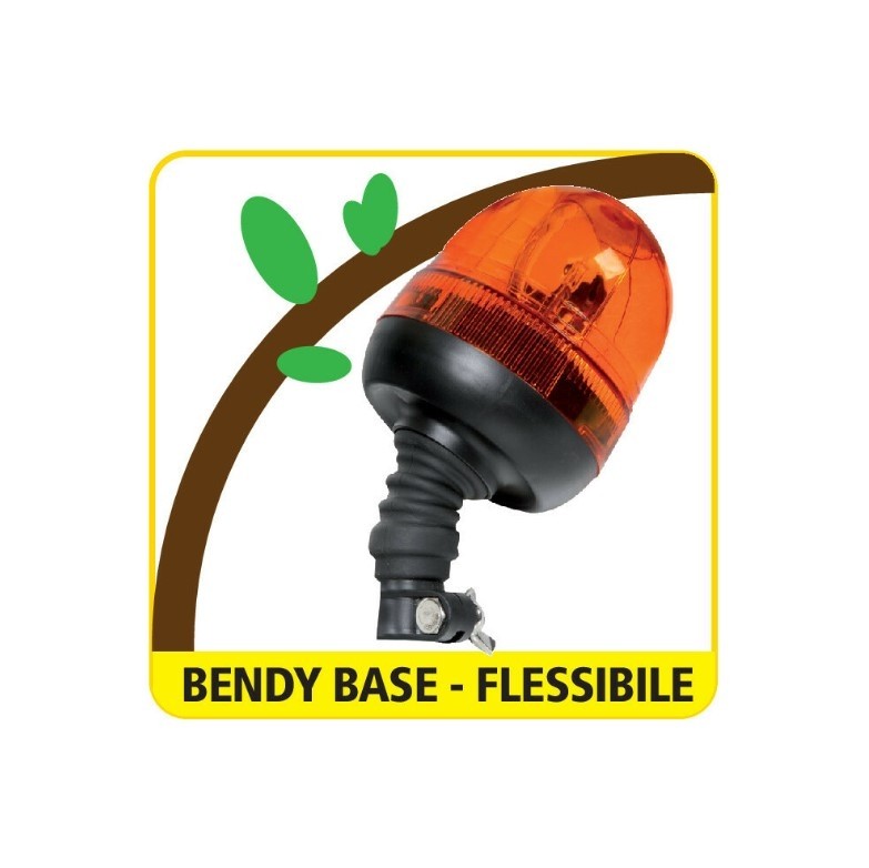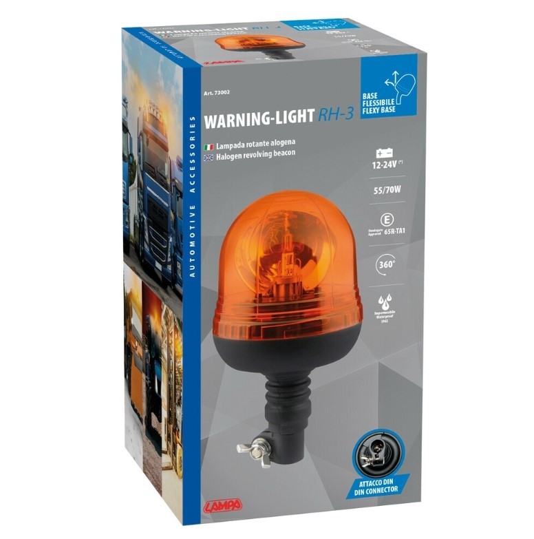 LAMPEGGIANTE LUCE EMERGENZA CON LUCE ROTANTE ALOGENA CON BASE FLESSIBILE LAMPA 73002. RH-3, luce di segnalazione alogena con base flessibile e attacco DIN, 12/24V. Per veicoli industriali, mezzi agricoli, di emergenza, di soccorso.... Trasmissione ad ingranaggio tramite vite senza fine. Lente in policarbonato. Attacco tubolare flessibile in gomma con innesto DIN. 8 differenti basi di fissaggio disponibili (da ordinarsi separatamente). Omologazione: E8 R65. Per i veicoli a 12V occorre sostituire la lampada 24V-H1-70W installata di serie con quella a 12V-H1-55W in dotazione.