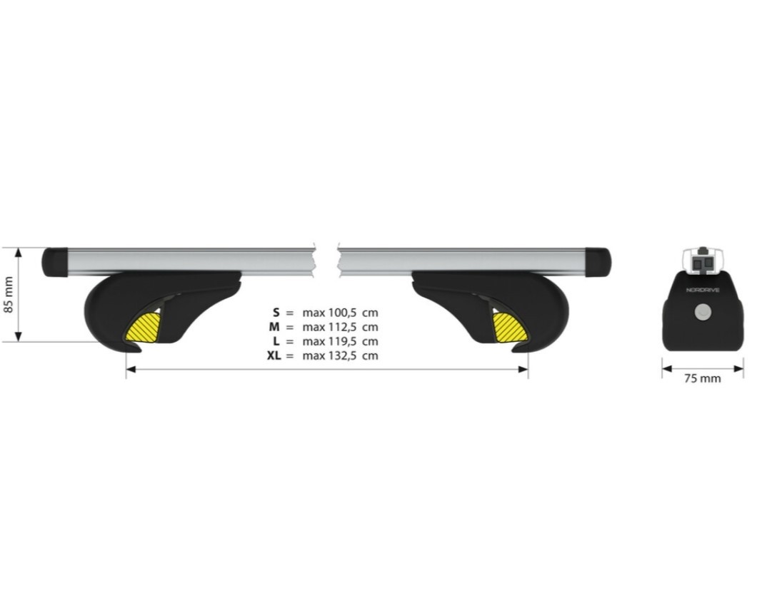SET COMPLETO BARRE PORTATUTTO IN ALLUMINIO - L - Evos RA NORDRIVE N15046. Elegante profilo tubolare in lega di alluminio anodizzato, con predisposizione per l’inserimento dei connettori rapidi “T” nella canalina superiore. Base di appoggio del carico in gomma. Complete di serratura antifurto. Pre-assemblate, pronte per un montaggio ultrarapido. Composto da: Coppia barre portatutto Helio N15076, Kit Evos RA N20012. Non superare mai il carico massimo delle barre. Questo limite è tuttavia subordinato al carico massimo riportato nel libretto uso e manutenzione del veicolo. Seguire sempre le indicazioni di carico massimo più basso. Con carico massimo si intende: peso delle barre + peso degli eventuali accessori applicati + peso del carico previsto. Vecchio nome: YURO. Distanza massima fra i mancorrenti: 119,5 cm.