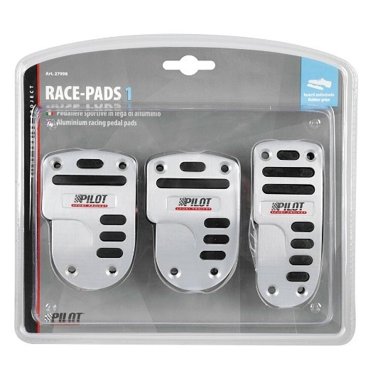 SET 03 PEDALI RACE 1 PILOT 27998. Set 3 pedali sportivi in alluminio con inserti in gomma antiscivolo. Montaggio tramite clips o viti passanti. Dimensioni: acceleratore 102 x 37 mm, frizione e freno 85 x 56 mm.