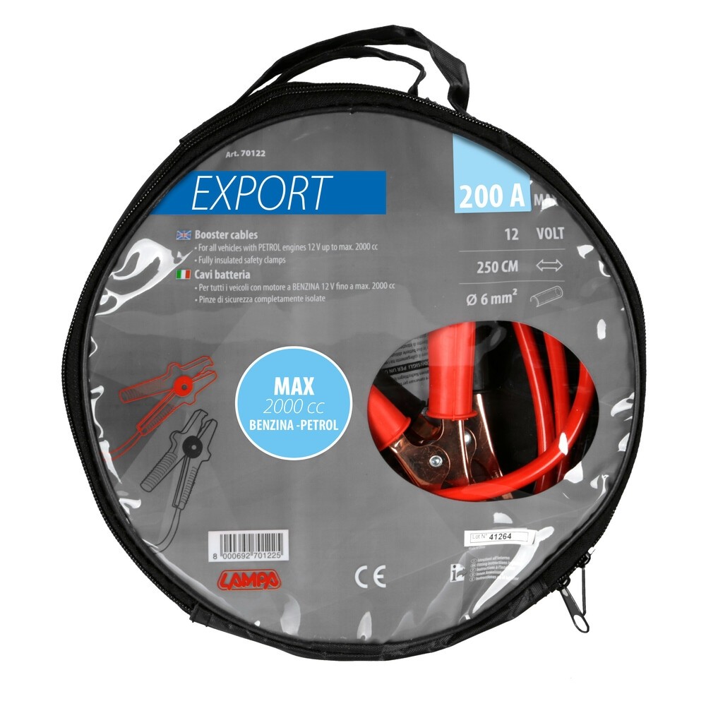 SET CAVI COLLEGAMENTO BATTERIA 12V 200A LAMPA. Art. 70122. Cavi batteria Export 12V - 250 cm - 200 A - 6 mm². Con pinze di sicurezza isolate. Molla delle pinze in acciaio temperato per una presa sicura sui poli batteria. Completi di pratica borsa/custodia.