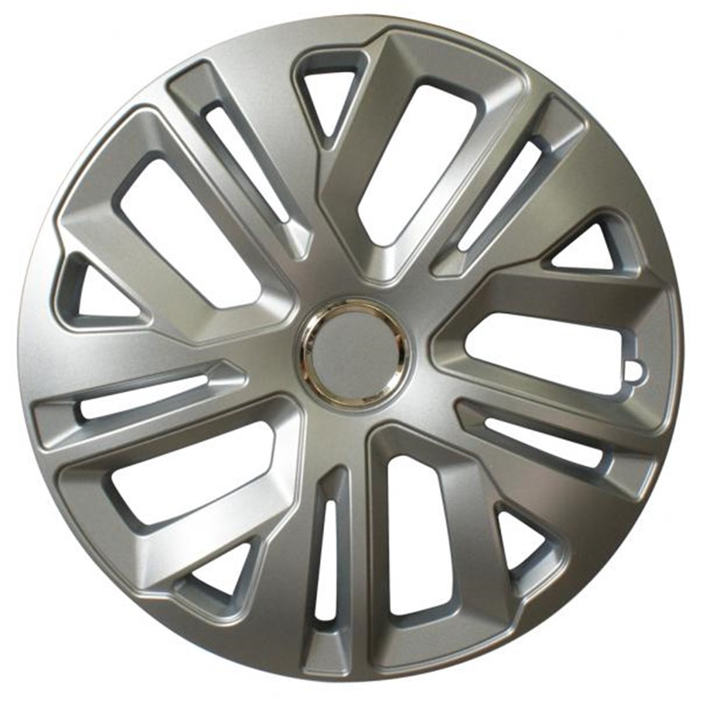 Set 4 copricerchi universali in abs antiurto di altissima qualità. Sistema di montaggio ultrarapido a pressione con anello metallico. Made in Europe. Per cerchi da 15".