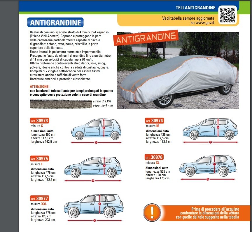 TELO PROTETTIVO COPRIAUTO ANTIGRANDINE GEV TAG. S 30973 TELI REALIZZATI CON UNO SPECIALE STRATO DI 4MM DI EVA ESPANSO (ETILENE VINIL ACETATO). PER COPRIRE E POTREGGERE LE PARTI DELLA CARROZZARIA PARTICOLARMENTE ESPOSTE AL RISCHIO DI GRANDINE: COFANO, TETTO, BAULE, CRISTALLI E LA PARTE SUPERIORE DELLE FIANCATE. PROTEGGE L'AUTO DA CHICCHI DI GRANDINE FINO AD 11MM CON VELOCITA' DI CADUTA FINO A 70 KM/H; IDEALE ANCHE CONTRO LA CADUTA DI CASTEGNE, PIGNE... FASCE POSTERIORI IN POLIESTERE ATERMICO E IMPERMEABILE. OTTIMA PROTEZIONE CONTRO EVENTI ATMOSFERICI, SOLE, SMOG, POLVERE. COMPLETO DI DUE CINGHIE SOTTOSCOCCA PER FISSARE IL TELO COPRIAUTO E RESISTERE A RAFFICHE DI VENTO. BORDATURE ANTERIORI E POSTERIORI ELASTICIZZATE. Per supporto all'acquisto contattare il servizio clienti. Info e Preventivi: infoshop@marinazauto.it - Whatsapp: (+39) 331 1804865